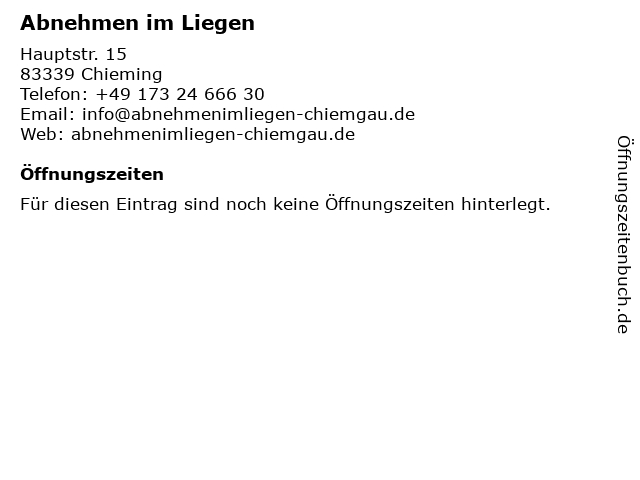 | Öffnungszeiten Abnehmen im Liegen in Chieming anzeigen | |