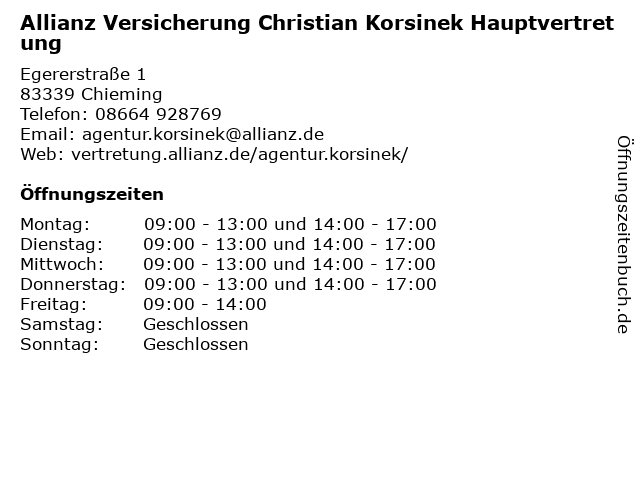 1 Allianz Versicherung Wolfgang Singer Hauptvertretung (Entfernung: 0,01 km) Egererstraße 1, 83339 Chieming 2 Allianz Versicherung Schützinger und Egger GbR Hauptvertretung (Entfernung: 4,25 km) Traunsteiner Straße 2, 83355 Grabenstätt 3 AXA Hauptvertretung Peter Wieser & Sebastian Koreck (Entfernung: 7,90 km) Obere Hammerstraße 2, 83278 Traunstein 4 Allianz Versicherung Josef Steinbacher Hauptvertretung (Entfernung: 8,38 km) Stadtplatz 13, 83278 Traunstein 6 Allianz Versicherung Norbert Hoyer Hauptvertretung (Entfernung: 14,58 km) Herzog-otto-straße 12, 83308 Trostberg |