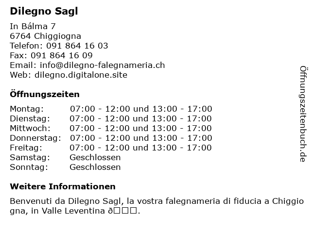 | Öffnungszeiten Dilegno Sagl in Chiggiogna anzeigen | |