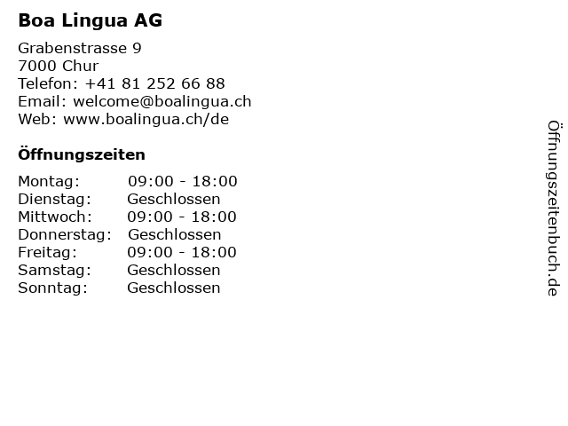 | Öffnungszeiten Boa Lingua AG in Chur anzeigen | |