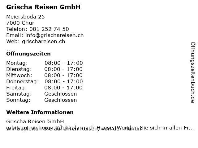 | Öffnungszeiten Grischa Reisen GmbH in Chur anzeigen | |