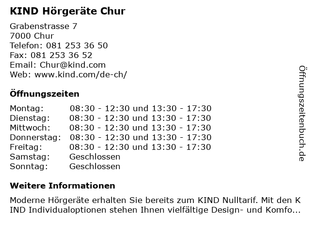 | Öffnungszeiten KIND Hörgeräte Chur in Chur anzeigen | |