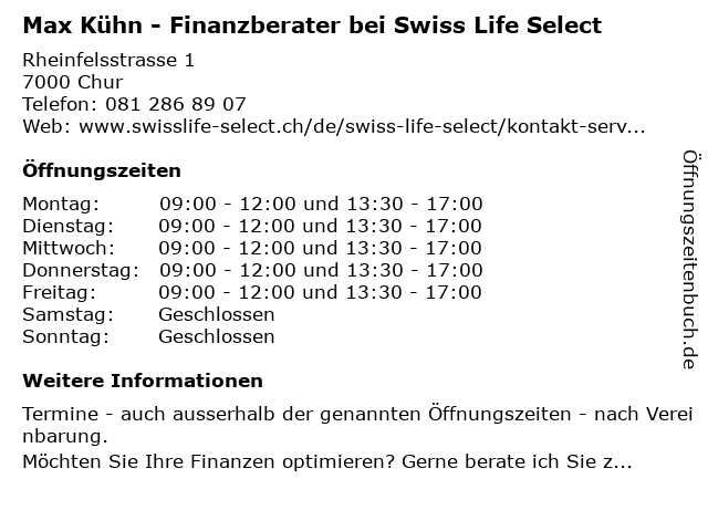 2 Mauro Steffen - Finanzberater bei Swiss Life Select (Entfernung: 0,00 km) Rheinfelsstrasse 1, 7000 Chur 3 Jean-Claude Müller - Führungskraft bei Swiss Life Select (Entfernung: 0,00 km) Rheinfelsstrasse 1, 7000 Chur 4 Danijel Trailovic - Führungskraft bei Swiss Life Select (Entfernung: 0,00 km) Rheinfelsstrasse 1, 7000 Chur 5 Romano Rossi - Finanzberater bei Swiss Life Select (Entfernung: 0,00 km) Rheinfelsstrasse 1, 7000 Chur 6 Remo Mattle - Finanzberater bei Swiss Life Select (Entfernung: 0,00 km) Rheinfelsstrasse 1, 7000 Chur |