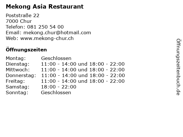| Öffnungszeiten Mekong Asia Restaurant in Chur anzeigen | |