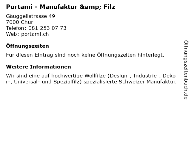 | Öffnungszeiten Portami - Manufaktur & Filz in Chur anzeigen | |