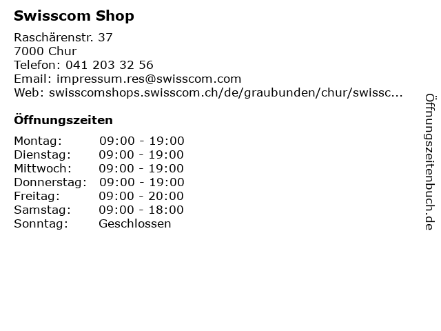 | Öffnungszeiten Swisscom Shop in Chur anzeigen | |