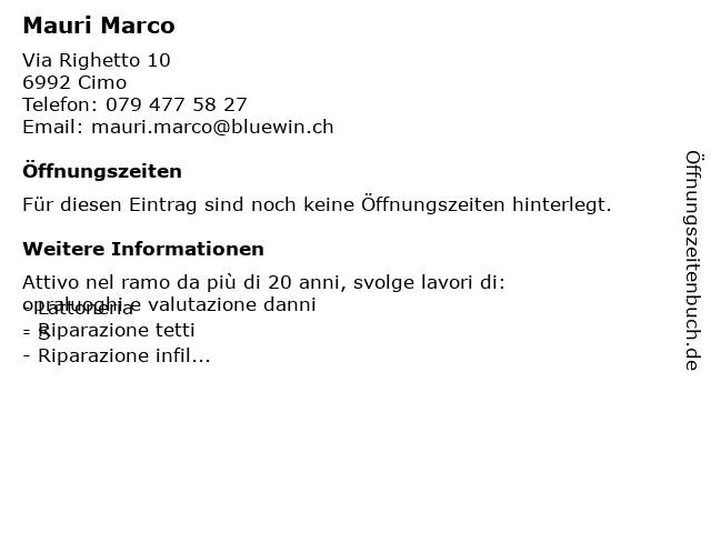 | Öffnungszeiten Mauri Marco in Cimo anzeigen | |