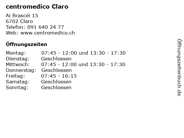 | Öffnungszeiten centromedico Claro in Claro anzeigen | |
