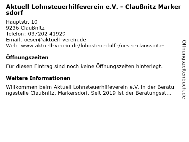 | Aktuell Lohnsteuerhilfeverein e.V. - Claußnitz Markersdorf anrufen | |