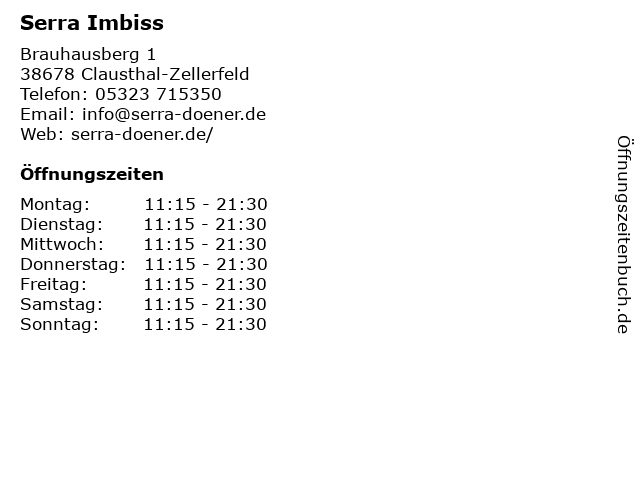 | Öffnungszeiten Serra Imbiss in Clausthal-Zellerfeld anzeigen | |