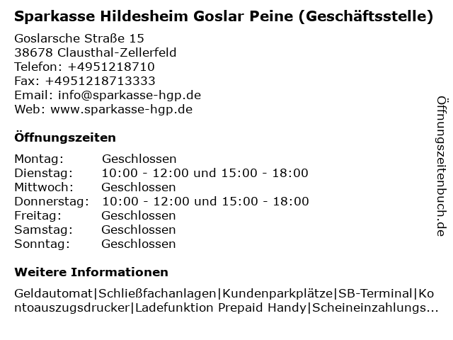 3 Sparkasse Hildesheim Goslar Peine (SB-Filiale) (Entfernung: 6,81 km) Kaspar-Bitter-Straße 7b, 38685 Langelsheim 4 6 |