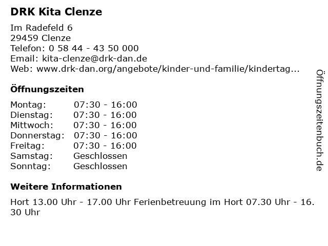 | Öffnungszeiten DRK Kita Clenze in Clenze anzeigen | |