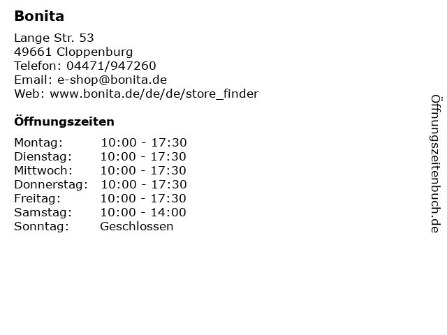 | Öffnungszeiten Bonita in Cloppenburg anzeigen | |