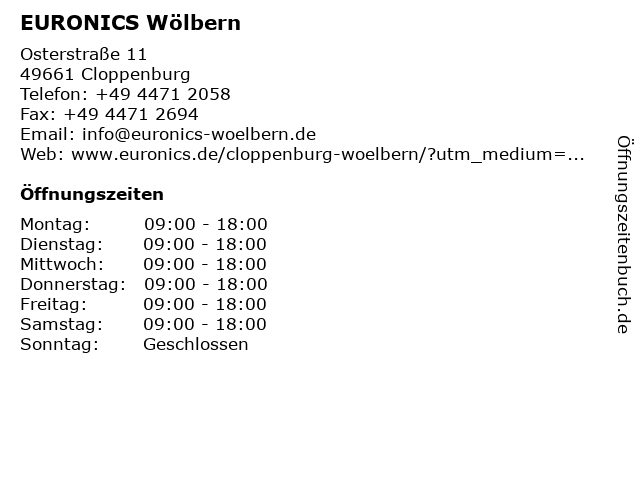 | Öffnungszeiten EURONICS Wölbern in Cloppenburg anzeigen | |