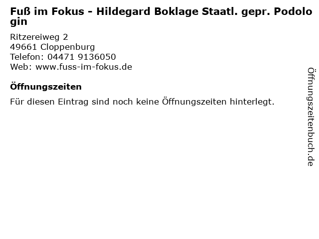 | Fuß im Fokus - Hildegard Boklage Staatl. gepr. Podologin anrufen | |