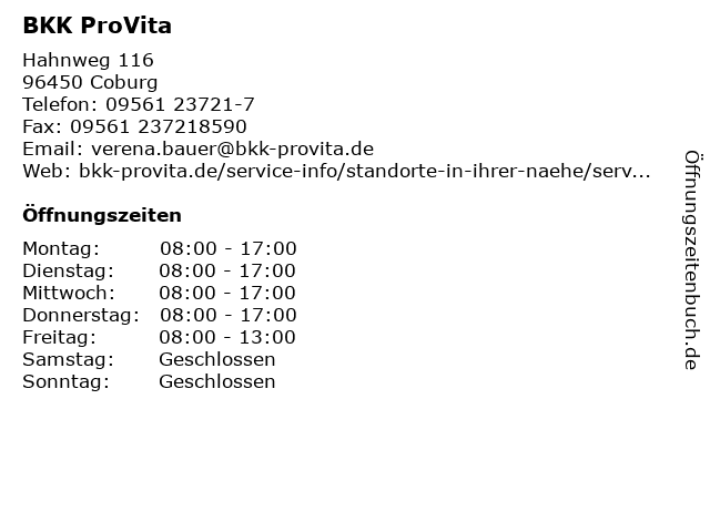 | Öffnungszeiten BKK ProVita in Coburg anzeigen | |
