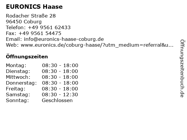 | Öffnungszeiten EURONICS Haase in Coburg anzeigen | |