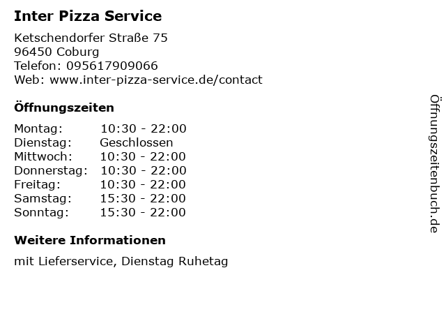 | Öffnungszeiten Inter Pizza Service in Coburg anzeigen | |