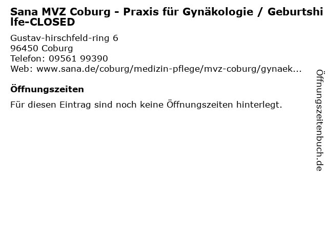 | Sana MVZ Coburg - Praxis für Gynäkologie / Geburtshilfe-CLOSED anrufen | |