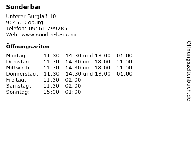| Öffnungszeiten Sonderbar in Coburg anzeigen | |