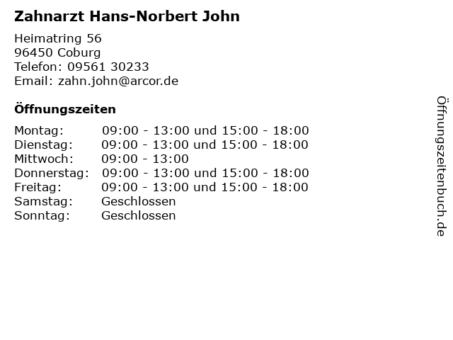 | Öffnungszeiten Zahnarzt Hans-Norbert John in Coburg anzeigen | |