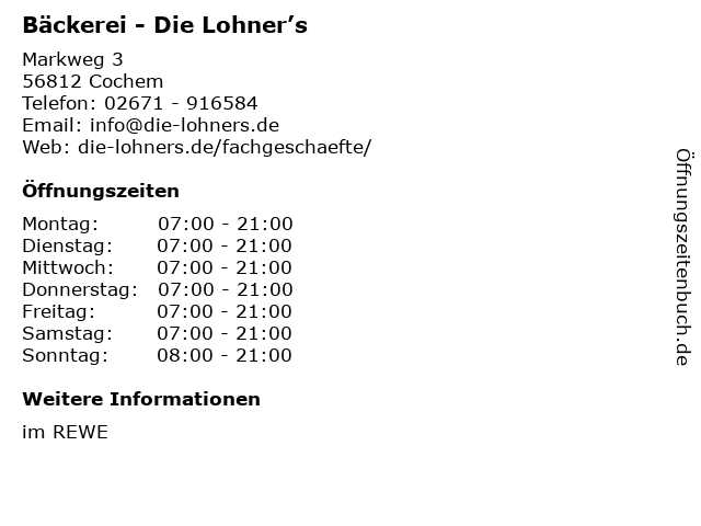 | Öffnungszeiten Bäckerei - Die Lohner’s in Cochem anzeigen | |