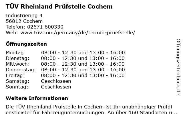Branchen & Suchbegriffe zu TÜV Rheinland Prüfstelle Cochem:prüfstelle, rheinland, tüv |