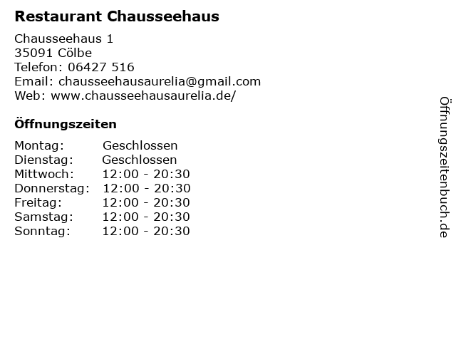| Öffnungszeiten Restaurant Chausseehaus in Cölbe anzeigen | |