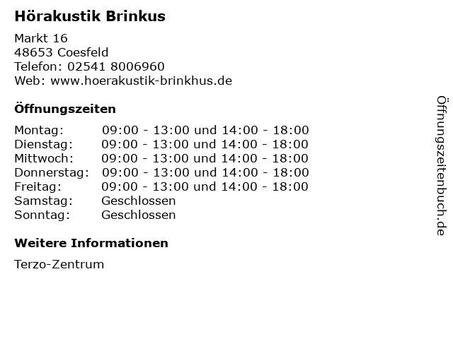 | Öffnungszeiten Hörakustik Brinkus in Coesfeld anzeigen | |