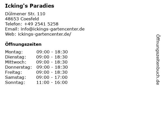 | Öffnungszeiten Icking's Paradies in Coesfeld anzeigen | |