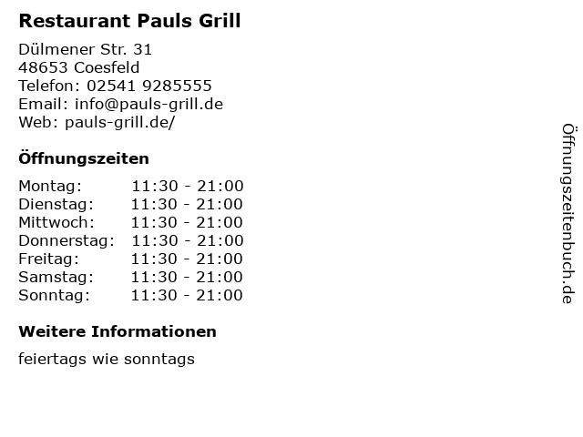 | Öffnungszeiten Restaurant Pauls Grill in Coesfeld anzeigen | |