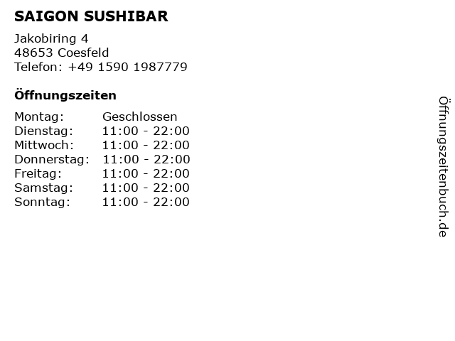 | Öffnungszeiten SAIGON SUSHIBAR in Coesfeld anzeigen | |