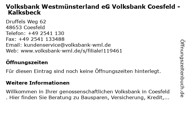 | Volksbank Westmünsterland eG Volksbank Coesfeld - Kalksbeck anrufen | |