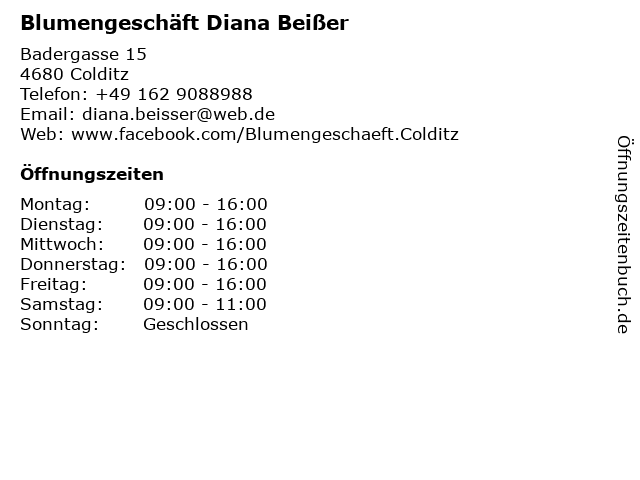 | Öffnungszeiten Blumengeschäft Diana Beißer in Colditz anzeigen | |