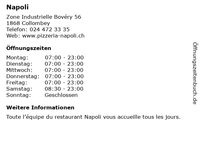 | Öffnungszeiten Napoli in Collombey anzeigen | |