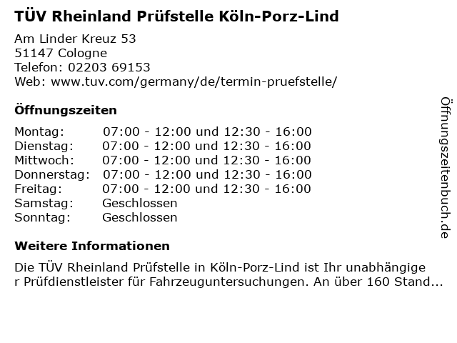 Branchen & Suchbegriffe zu TÜV Rheinland Prüfstelle Köln-Porz-Lind:lind, porz, prüfstelle, rheinland, tüv |