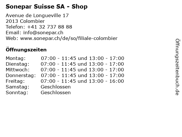 | Öffnungszeiten Sonepar Suisse SA - Shop in Colombier anzeigen | |