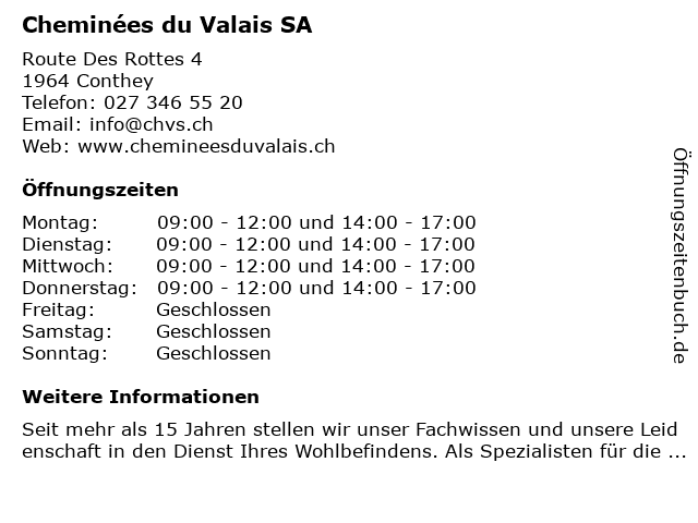 Öffnungszeiten Cheminées du Valais SA