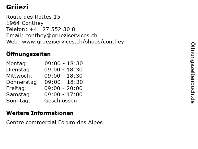 | Öffnungszeiten Grüezi in Conthey anzeigen | |