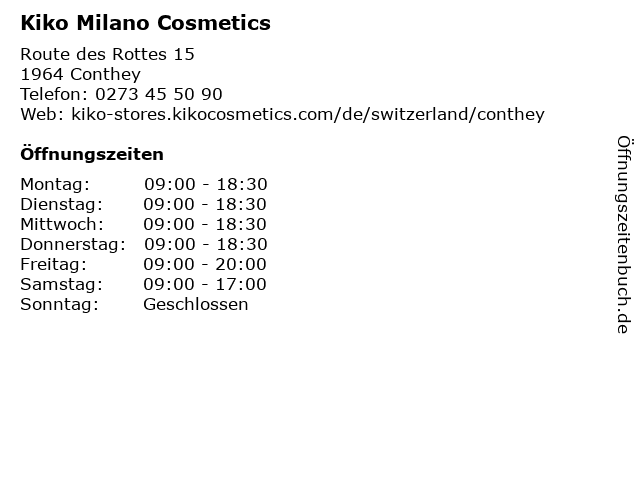 | Öffnungszeiten Kiko Milano Cosmetics in Conthey anzeigen | |