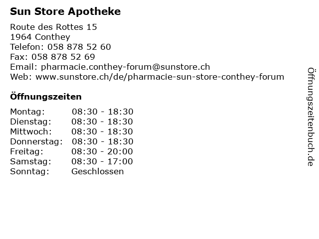| Öffnungszeiten Sun Store Apotheke in Conthey anzeigen | |