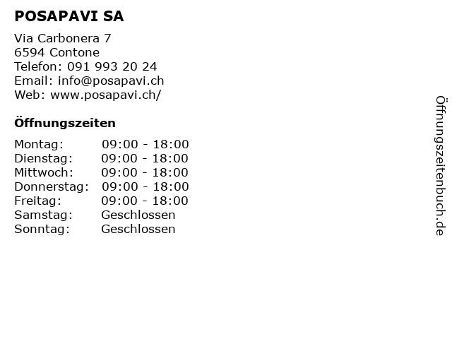 | Öffnungszeiten POSAPAVI SA in Contone anzeigen | |