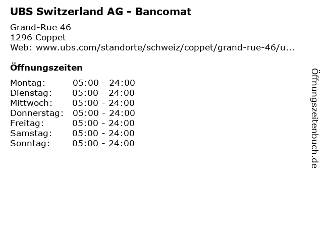 | Öffnungszeiten UBS Switzerland AG - Bancomat in Coppet anzeigen | |