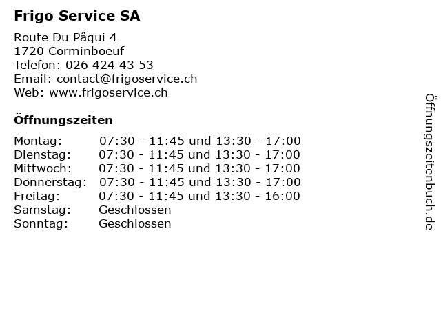 | Öffnungszeiten Frigo Service SA in Corminboeuf anzeigen | |