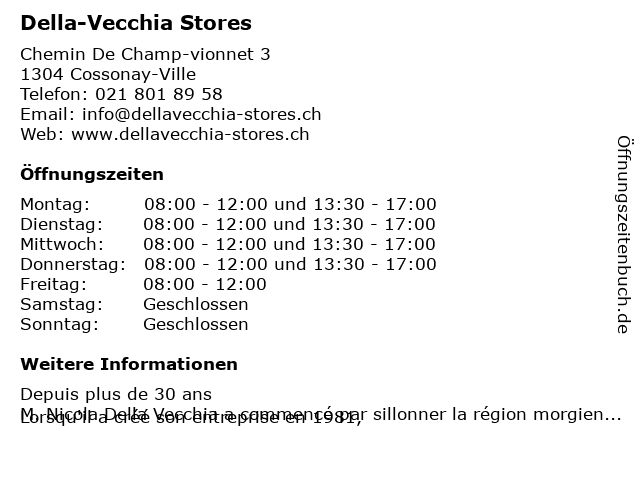 | Öffnungszeiten Della-Vecchia Stores in Cossonay-Ville anzeigen | |