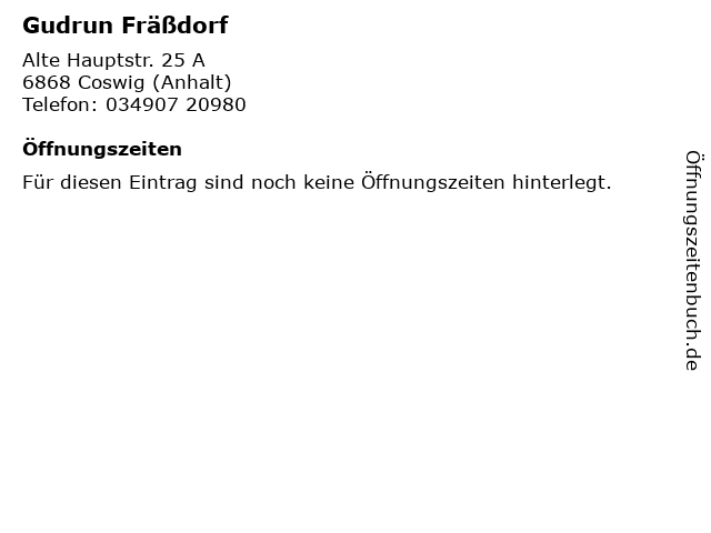 | Öffnungszeiten Gudrun Fräßdorf in Coswig (Anhalt) anzeigen | |