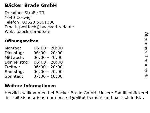 | Öffnungszeiten Bäcker Brade GmbH in Coswig anzeigen | |