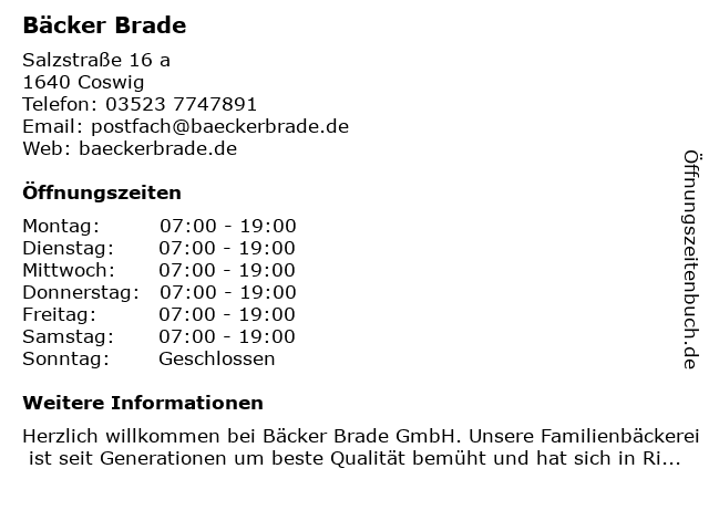 | Öffnungszeiten Bäcker Brade in Coswig anzeigen | |