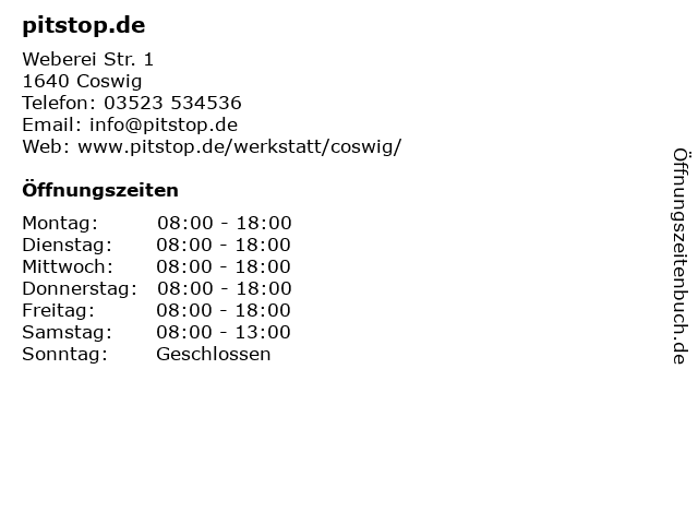 | Öffnungszeiten pitstop.de in Coswig anzeigen | |