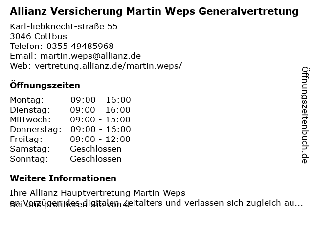 2 Allianz Versicherung Lars Biechteler Generalvertretung (Entfernung: 0,41 km) Berliner Straße 68, 03046 Cottbus 3 Allianz Versicherung Andreas Splitt Generalvertretung (Entfernung: 1,28 km) Schillerstraße 33, 03046 Cottbus 4 Allianz Versicherung Uwe Jacob Generalvertretung (Entfernung: 1,95 km) Brandenburger Platz 2-3, 03046 Cottbus 5 Allianz Versicherung Diego Saleh Generalvertretung (Entfernung: 2,28 km) Ostrower Damm 20, 03046 Cottbus 6 Allianz Versicherung Robert Reinke Generalvertretung (Entfernung: 2,98 km) Schlachthofstraße 11, 03044 Cottbus |